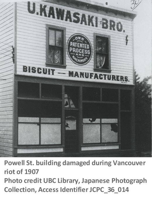 Tensions grew in B.C. with the arrival of an increasing number of Asians. During the first ten months of 1907, for instance, 8125 Japanese, 2000 Sikhs, and approximately 1300 Chinese landed in the province. Of these groups, the Japanese were considered to be the greatest threat to the white community. The fears, hate, and discrimination culminated in the Vancouver Riot on September 7, 1907 in which a mob of anti-Asian protestors rampaged through the Japanese and Chinese districts in Vancouver. While there were no deaths, there was substantial property damage for which some Japanese businesses were compensated up to $2,500. More importantly the riot resulted in the Hayashi-Lemieux Agreement between Canada and Japan in 1908 that limited the annual number of male labourers and domestic servants to 400. This was the first step to further discriminatory measures. This Gentlemen’s Agreement was revised in 1928 restricting the number of Japanese immigrants to 150 including women and children.