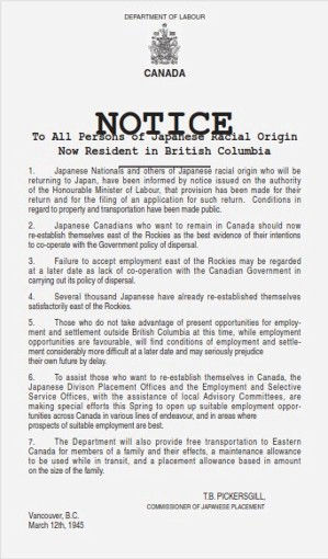 The Japanese place in Canada's history remains secure. Nothing, in fact, seems to have stirred the disquiet of those Canadians interested in civil liberties more than the wartime treatment of the Japanese. It is the skeleton in the closet that stalks out to haunt discussions on civil liberties.(Adachi, 1976)
