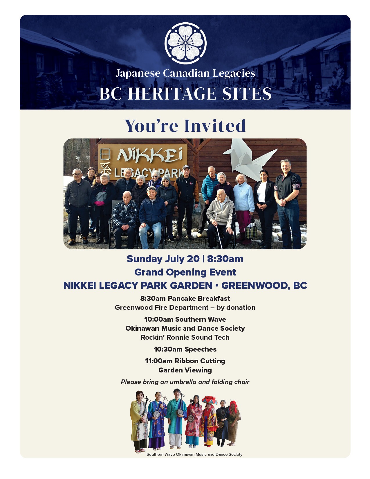 The Greenwood Nikkei Memorial Garden came to fruition mainly due to the generous funding from the Japanese Canadian Legacies Society and the Heritage Site group and the full support and unbelievable in-kind service from the City of Greenwood. The Greenwood Public Works crew and the Kunon and Japonica Landscaping companies did an amazing job in completing project.