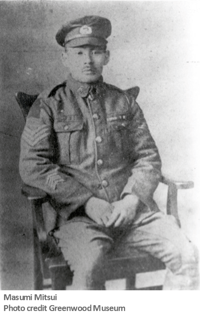 Masumi Mitsui along with twelve other JC soldiers earned the Military Medal. 54 JC soldiers were killed in action and many wounded. Mr. Mitsui's story is well-documented. He was awarded the Military Medal because he led his troop to overtake a German machine gun nest. After being interned in Greenwood, B.C., he took his family to Hamilton, Ontario after WWII ended. In April 1920, the Japanese Canadian community in B.C. raised money to construct the war memorial in the City of Vancouver’s Stanley Park.The Japanese Canadian soldiers fought for the franchise, but again they were refused by the Canadian government. It took until 1931, but only the veterans succeeded in the right to vote. Masumi Mitsui was the first president of the newly formed Canadian Legion Branch No. 9. Then, World War II happened. With the War Measures Act enforced, all Japanese Canadians were forcibly removed from the 100-mile restricted area along the west coast of B.C. Masumi was so enraged with the government’s action that he threw down the medals on the floor, and said, “What good are these?” Twelve of the WWI veterans were sent to Greenwood in 1942. They were asked to be a night watchman or to restore order in case of unrest. After the war, the government’s ultimatum was, “Go East of the Rockies or go to Japan”. The City of Greenwood protested to keep their ‘new friends’ from being forcibly removed again. As a result, several of the veterans’ families chose to make Greenwood their place of residence.